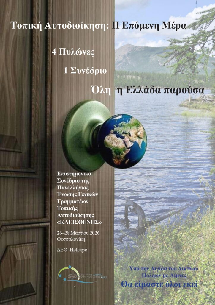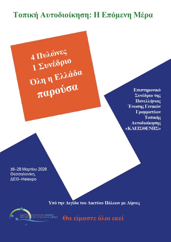 Το Δίκτυο Πόλεων με Λίμνες έχει την τιμή να δίνει την αιγίδα του στο Επιστημονικό Συνέδριο της Πανελλήνιας Ένωσης Γενικών Γραμματέων Τοπικής Αυτοδιοίκησης «ΚΛΕΙΣΘΕΝΗΣ», με τίτλο «Τοπική Αυτοδιοίκηση: Η Επόμενη Μέρα», που θα πραγματοποιηθεί στις 26–28 Μαρτίου 2026, στη Θεσσαλονίκη, στη ΔΕΘ-Helexpo.